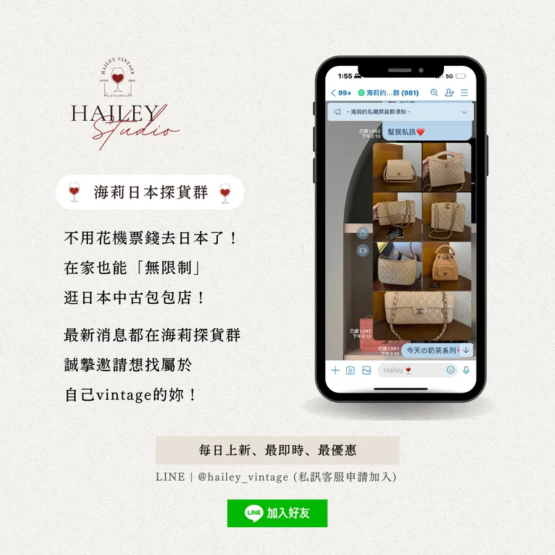 Hailey Vintage 收藏手冊: 1.台灣合法登記營業 2.日本專業鑑定師鑑定 3.商品自日本政府認證古物商許可商家 4.台中勤美實體店(預約制) Hailey Vintage 收藏須知: 中古包為奶奶等級,歲月即是最好的證明,不接收試用期及正常使用痕跡、年份感、款式不符預期等原因退換貨。 1.代購:代收款項代購業務,無7日鑑賞期,訂購前請確認包況細節及款式。 2.現貨:7日鑑賞期非試用期,不接受任何經使用後的退換貨處理,到貨時請拍攝開箱影片,若有疑問請當下聯繫客服,逾時不候。 備註事項: 1.於確認商品並支付訂金後,雙方代購委任契約即成立,請先確認支付價款之方式為可行,嗣後於契約期間,若一方欲終止代購委任契約,需得另一 方同意始得終止。 2.若因可歸責於買方之原因而終止雙方代購委任契約,買方需支付違約 金新臺幣 30 萬元。